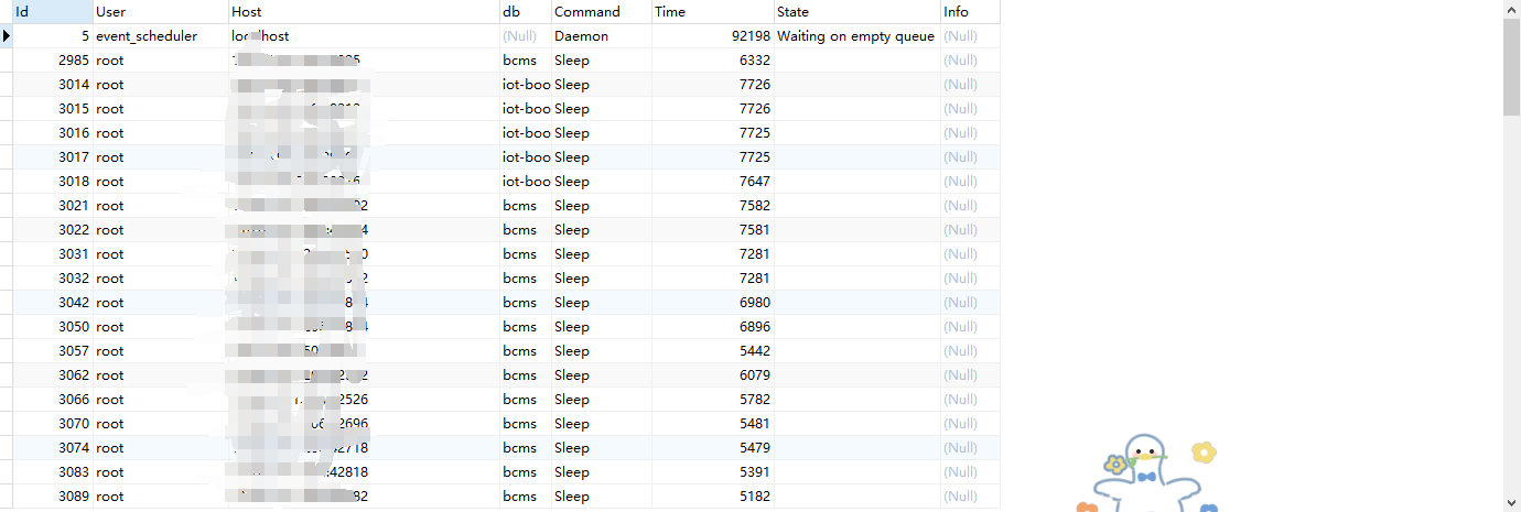 线程正在执行的SQL语句(可能为NULL)。根据查询结果观察是否有长时间未被释放的连接,例如出现大量超过1小时的休眠状态的线程,请检查连接数据库代码是否有做连接超时处理及关闭数据库连接,允许的情况下可以配置检测连接是否有效。