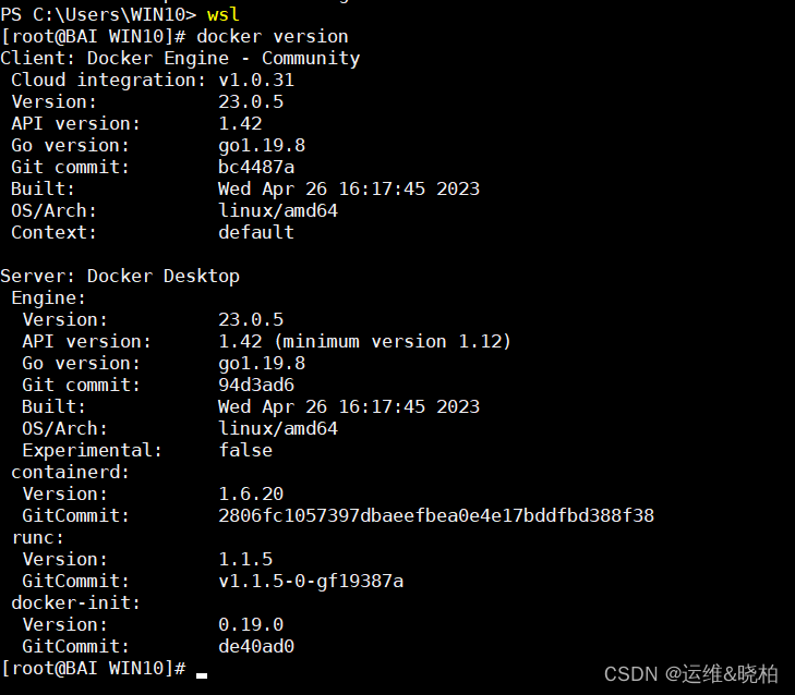 进入到 CentOS7 里,执行 docker version 可以看到,CentOS7 已经安装好了 docker 服务且和 docker-desktop 版本一致。